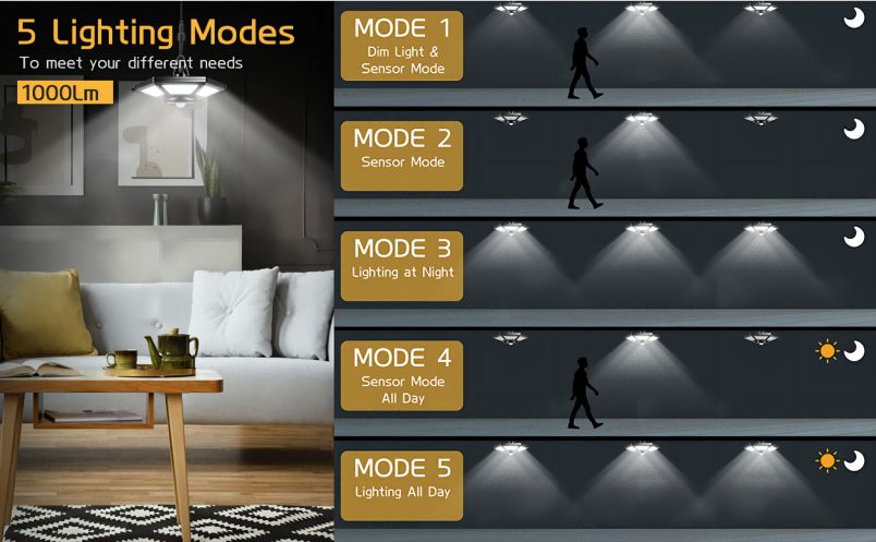 哦戶外太陽能運動感應棚燈具有 5 種照明模式。