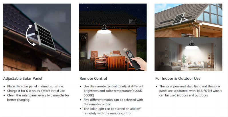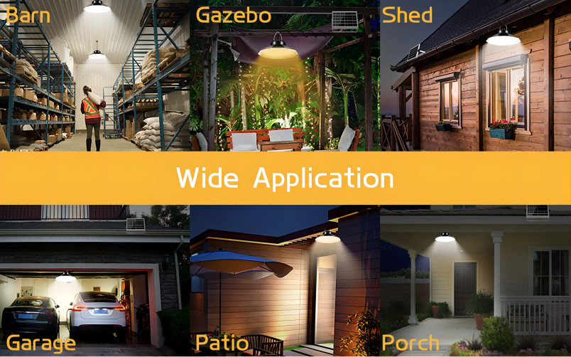 4.應用廣泛 這款太陽能棚燈有 3 種色溫:4000K-6000K(暖色、白色、混合色),三合一,可滿足不同環境和場景的需求,